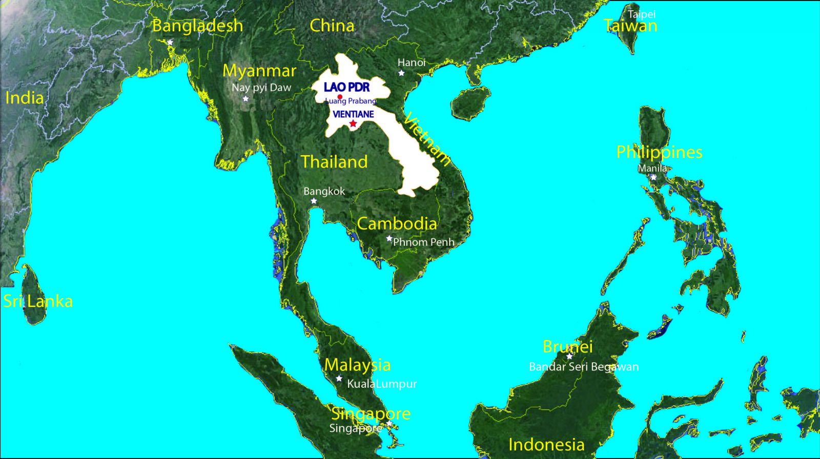 | Peta Laos (warna putih) di tengah negara-negara Asia Tenggara lainnya. |