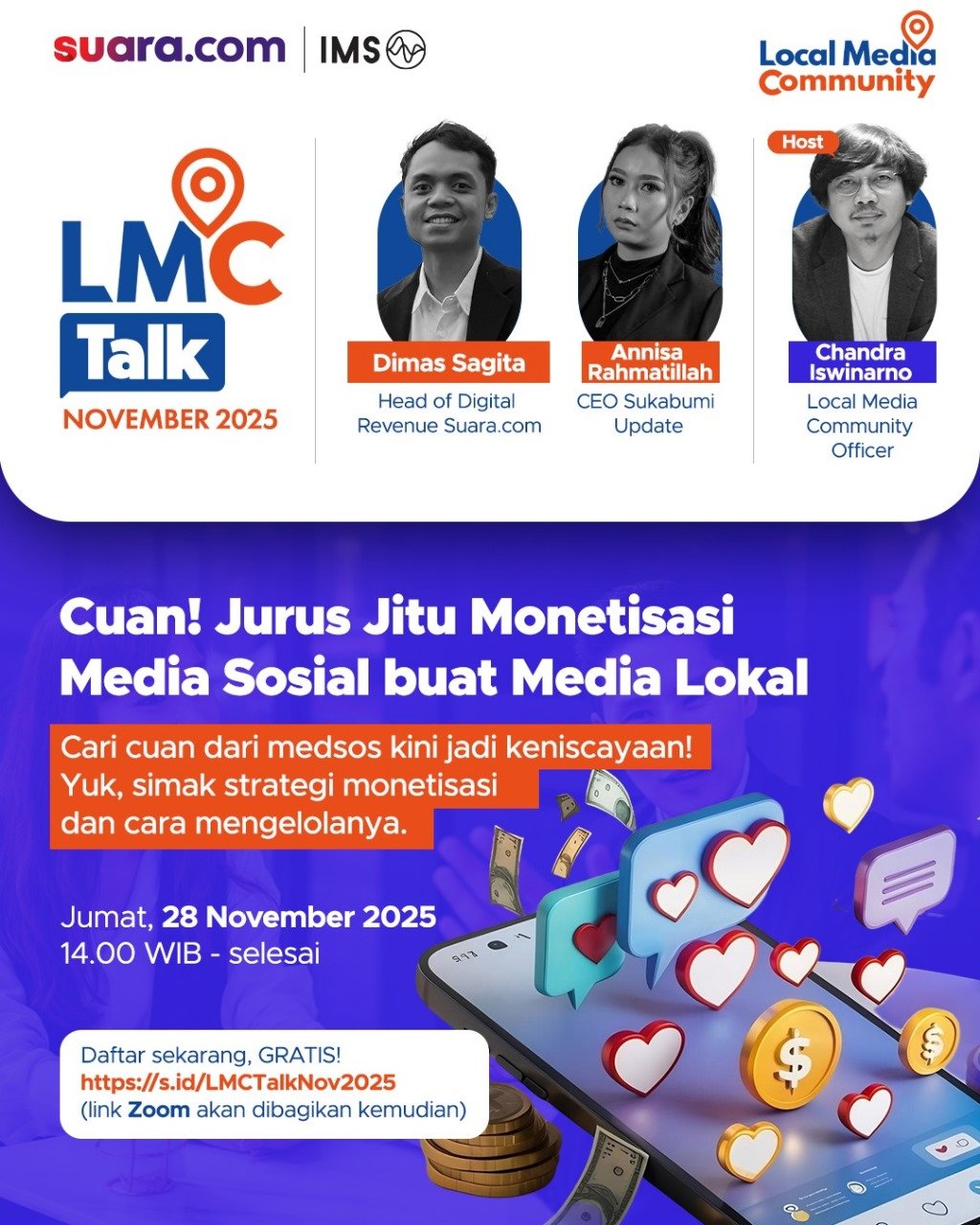 Local Media Community (LMC) kembali menggelar LMC Talk Edisi November 2025 dengan tema yang sangat relevan: “Cuan! Jurus Jitu Monetisasi Media Sosial buat Media Lokal.”