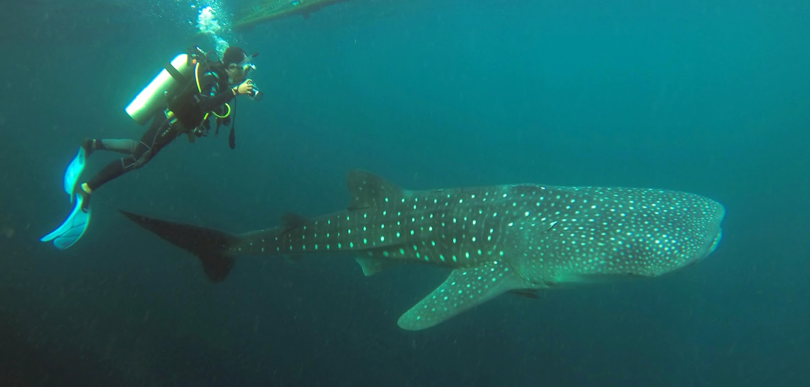 | Penulis di situs Hiu Paus (whale shark/Rhincodon typus), Kwatisore, Teluk Cenderawasih, Papua |