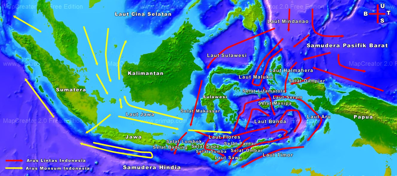 Ketiga, Arus Lintas Indonesia yang mengalir dari Samudera Pasifik melalui Laut Halmahera dan