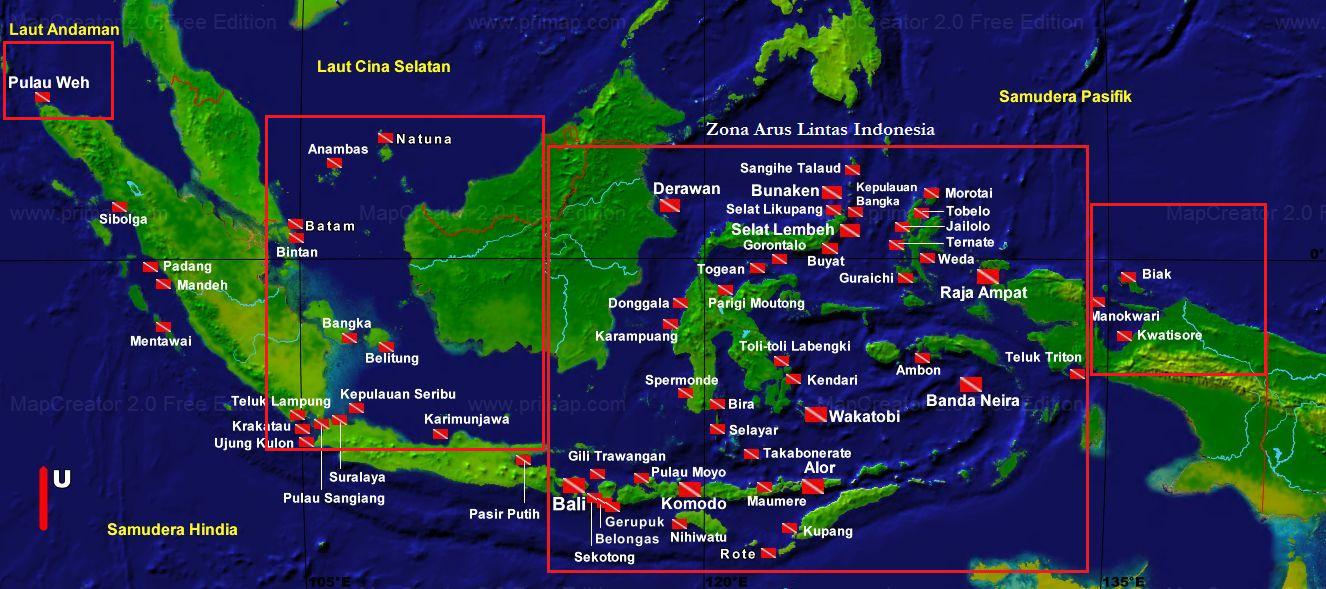 Diperkirakan ada lebih 8.000 pulau besar dan kecil yang tersebar di dalam kawasan Zona Arus Lintas Indonesia ini. Lebih 98 persen merupakan pulau-pulau kecil. Salah satu ciri pulau-pulau kecil ini, biasanya tidak memiliki sungai besar, sehingga perairan sekitarnya bening, situasi yang dicari para wisatawan selam. Selain bisa ditempuh dengan wisata penyelaman berbasis darat (land-base diving), spot-spot pulau kecil ini paling ideal ditempuh dengan cara pesiar selam (diving liveaboard).